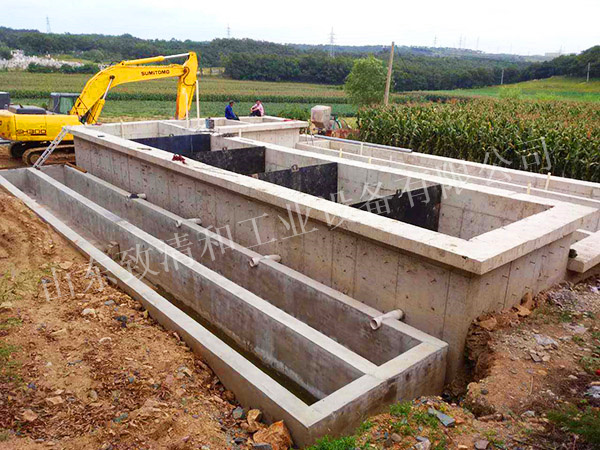 养殖污水经过气浮后,由提升泵送入厌氧反应器(UASB厌氧反应器、CSTR厌氧反应器等)。污水经过厌氧处理后,进入缺氧-好氧接触氧化池,有机物进一步氧化分解,同时在碳化作用趋于完全的情况下,硝化作用能顺利进行,同时,由接触氧化池回流至缺氧池的混合液在缺氧池反硝化菌作用下进行反硝化,达到生物脱氮的目。好氧池出水流入二沉池,进一步固液分离同时深度净化。