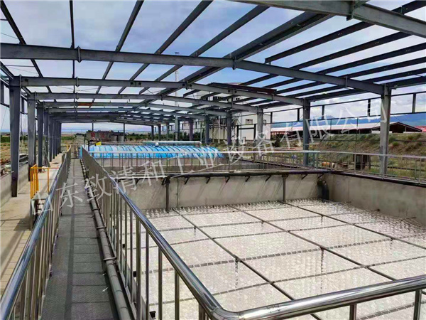 养殖污水经过气浮后,由提升泵送入厌氧反应器(UASB厌氧反应器、CSTR厌氧反应器等)。污水经过厌氧处理后,进入缺氧-好氧接触氧化池,有机物进一步氧化分解,同时在碳化作用趋于完全的情况下,硝化作用能顺利进行,同时,由接触氧化池回流至缺氧池的混合液在缺氧池反硝化菌作用下进行反硝化,达到生物脱氮的目。好氧池出水流入二沉池,进一步固液分离同时深度净化。